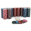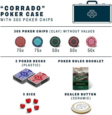 JEU DE POKER COMPLET : Cette mallette de poker «Corrado» de Bullet Playing Cards contient tout le nécessaire pour jouer au poker : 300 jetons en argile, 2 jeux de cartes bleu et rouge en plastique, 5 dés, 1 bouton dealer en céramique et 1 livret avec les règles du jeu