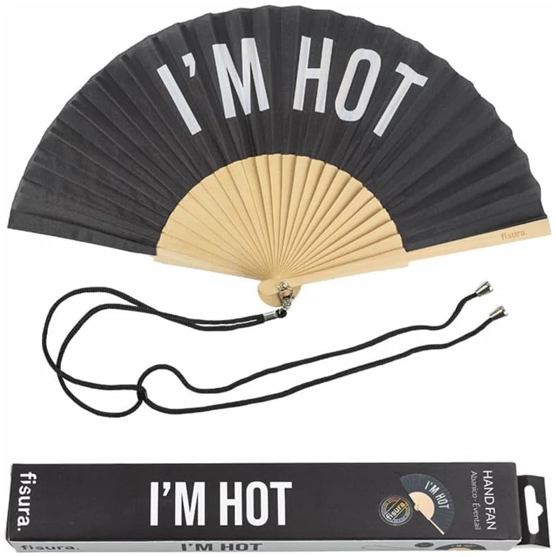 Éventail original avec message I’M HOT : Cet éventail est un accessoire moderne et amusant en bois, conçu pour vous rafraîchir avec style. Sa conception pliante et son cordon pratique le rendent facile à transporter et à utiliser.