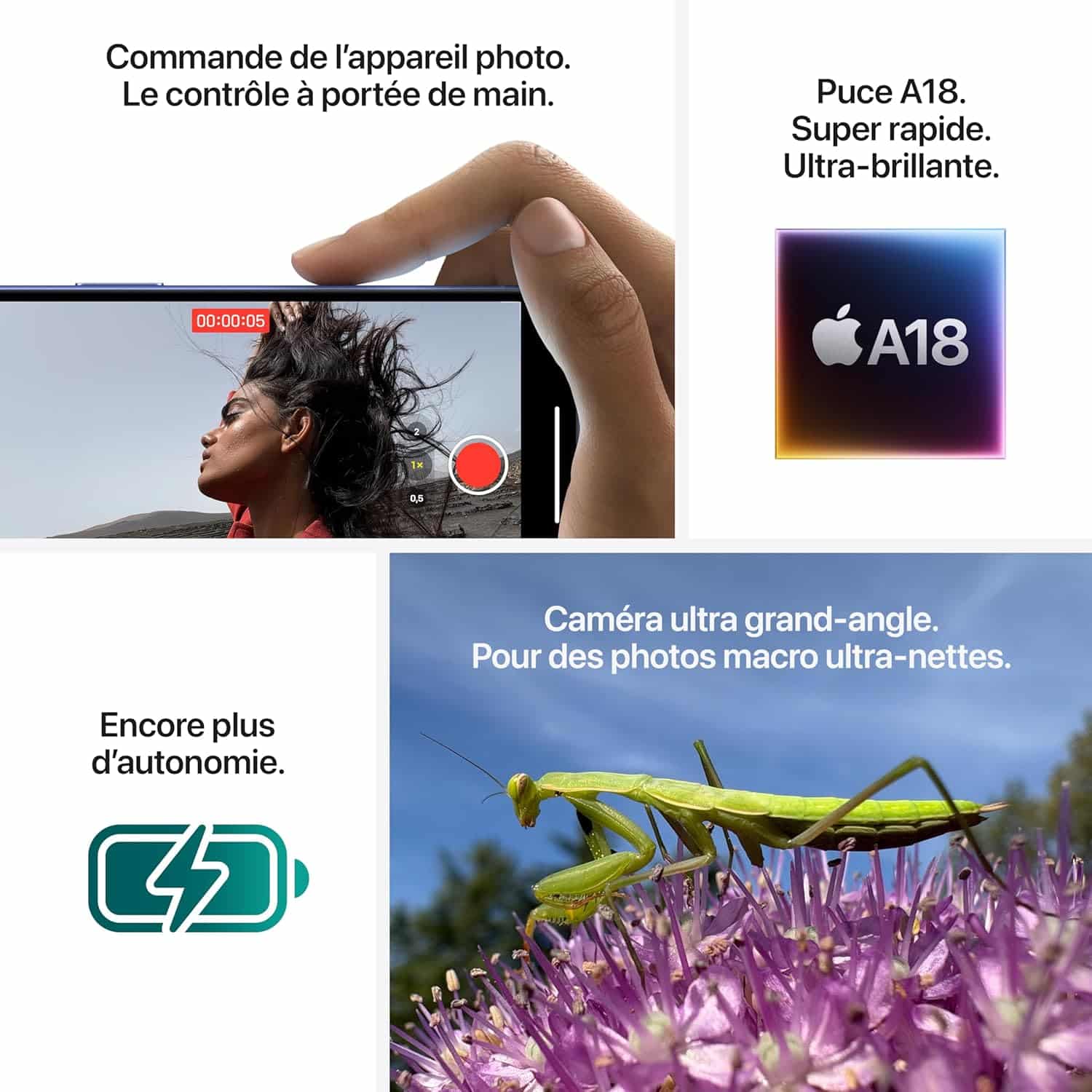L’iPhone 16 Plus introduit une Commande de l’appareil photo révolutionnaire qui rend la photographie encore plus accessible. En quelques gestes, vous pouvez ajuster l’exposition, la profondeur de champ, zoomer ou changer d’objectif, sans quitter des yeux le sujet que vous souhaitez capturer. Cette fonctionnalité vous permet de passer facilement de la photographie à la vidéo, tout en ajustant rapidement vos réglages pour obtenir le meilleur résultat.