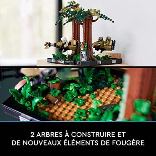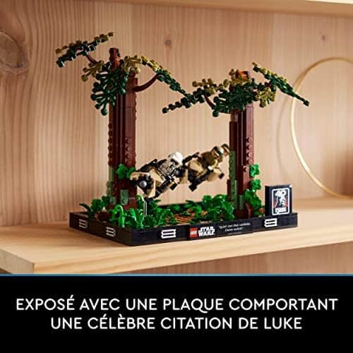 Créez le décor dynamique en briques LEGO de la poursuite d’un soldat éclaireur par la princesse Leia et Luke Skywalker sur la lune forestière d’Endor avec ce set LEGO Star Wars pour adultes