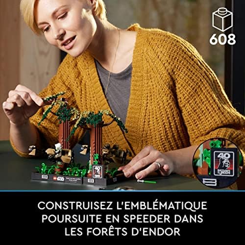 « Capturez le dynamisme d’une scène passionnante du film Star Wars : Le retour du Jedi en construisant le Diorama de la Course-Poursuite en Speeder sur Endor LEGO Star Wars (75353). Une maquette LEGO pour adultes, parfait pour célébrer le 40e anniversaire du Retour du Jedi. Cette maquette de construction de diorama LEGO comprend des minifigurines de 3 personnages de Star Wars, la princesse Leia et Luke Skywalker en tenue d’Endor, ainsi qu’un éclaireur. Luke porte son sabre laser vert, tandis que Leia et l’éclaireur ont chacun un pistolet blaster. Le kit à construire pour adultes comprend 2 speeder bikes équipés d’éléments transparents qui permettent de les placer de biais pour recréer les mouvements dynamiques de la scène de poursuite dans les forêts d’Endor. L’ensemble comprend également 2 arbres à construire en briques, ainsi que des éléments de fougère, une nouveauté pour mai 2023. Pour compléter ce modèle à construire et à exposer, une plaque avec les mots de Luke Skywalker « Vite ! Brouillez leur émission. Bouton du centre ! » et une plaque avec le logo du 40e anniversaire de Star Wars : Le retour du Jedi. La maquette de diorama LEGO fait partie d’une collection LEGO Star Wars pour adultes, qui comprend d’autres dioramas à construire représentant des scènes mémorables, et constitue un super cadeau pour tous les adultes fans de Star Wars. L’application LEGO Builder offre un moyen pratique de conserver les instructions d’assemblage et de suivre les progrès, avec des outils pour zoomer et faire pivoter les modèles en 3D. Contient 608 pièces »