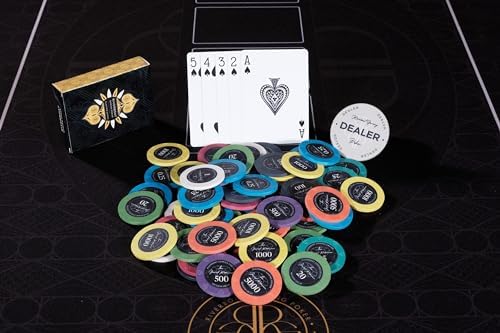 Inclus : 2 paquets de cartes à jouer en plastique de haute qualité et 1 bouton de croupier en céramique de 55 mm et 19 grammes.